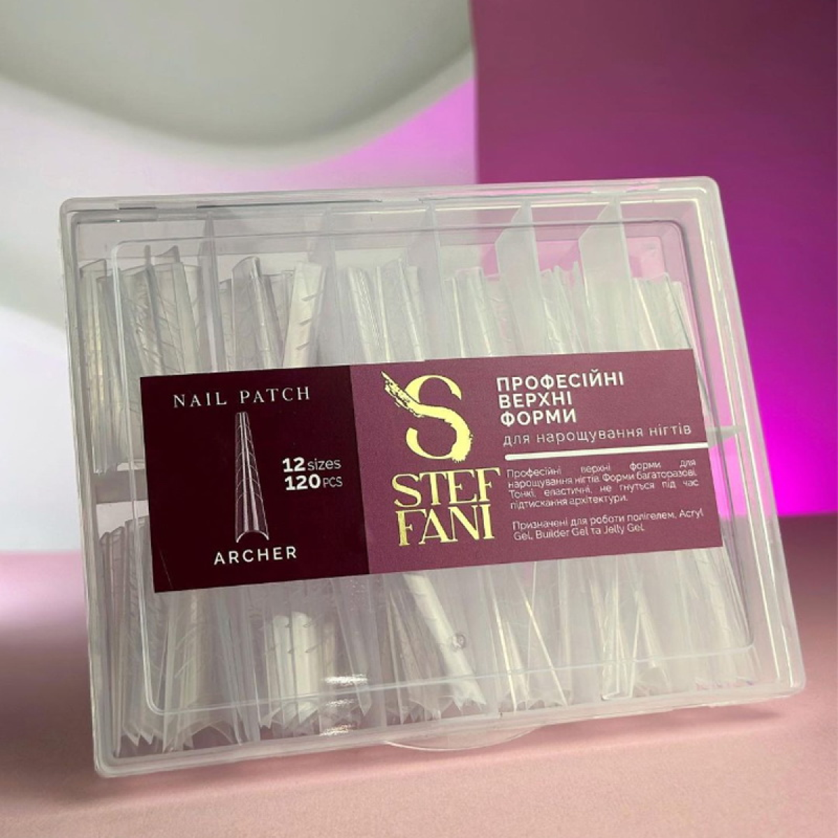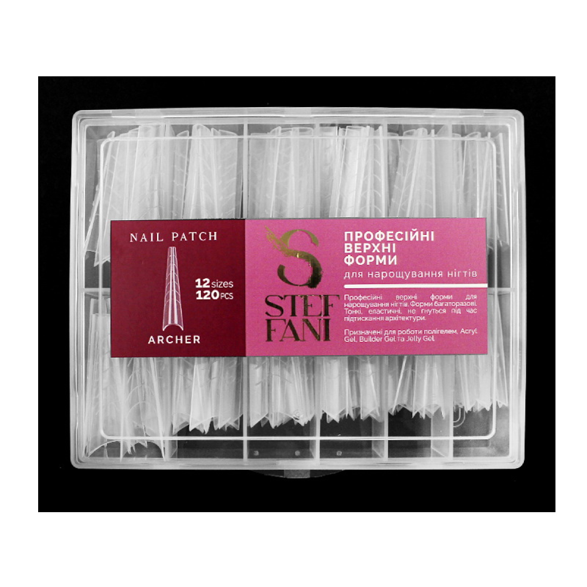 ВЕРХНІ ФОРМИ ДЛЯ НАРОЩУВАННЯ НІГТІВ STEFFANI NAIL PATCH ARCHER. АРКОВИЙ КВАДРАТ. З РОЗМІТКОЮ. ПРОЗОРІ. 120 ШТ.