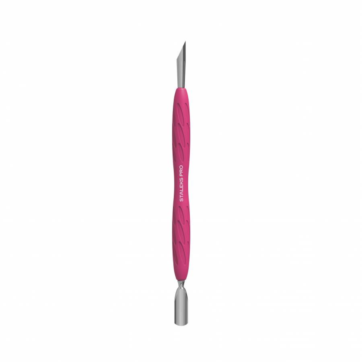 Ручка із силікону допомагає рівномірно розподілити тиск на поверхні пальця, запобігаючи пошкодженню шкіри та дискомфорту. Вона легше очищається й дезінфікується, що робить використання пушера в салонах краси максимально гігієнічним. Рожева насадка на ручці зручна для захоплення інструменту без ковзання, що дає змогу майстру працювати без напруги кисті.