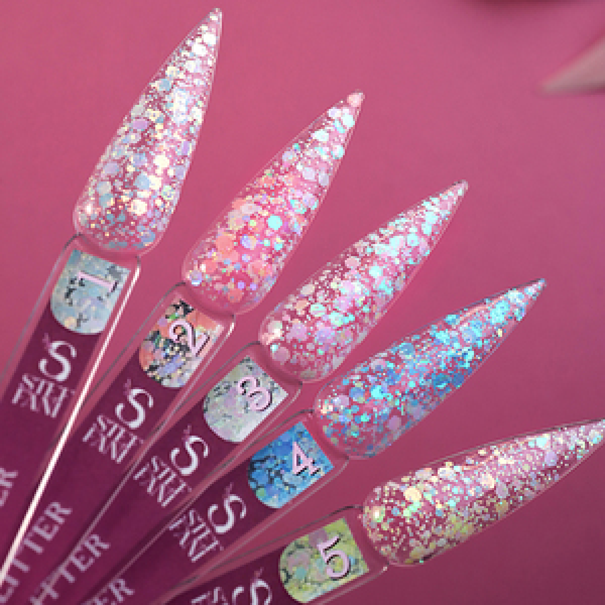 Confetti створені із поєднання різних блискіток та їх форм, а при попаданні світла неймовірно красиво переливаються.